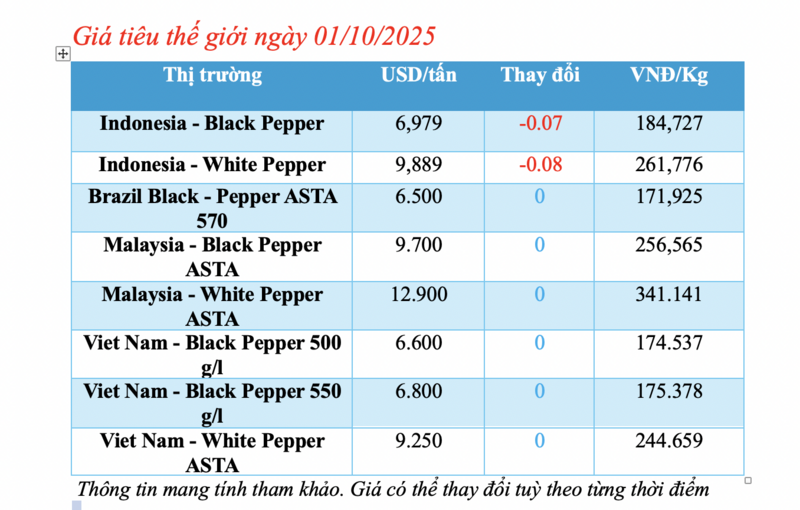 Cập nhật giá tiêu thế giới từ Hiệp hội Hồ tiêu Quốc tế (IPC) lúc 4 giờ 30 phút sáng 01/10/2025, thị trường hồ tiêu xuất khẩu hôm nay ghi nhận sự giảm nhẹ của thị trường Indonesia.