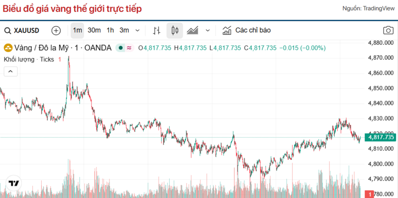 Theo Kitco, giá vàng thế giới ghi nhận lúc 4h30 hôm nay theo giờ Việt Nam giao ngay ở mức 4,817.73 USD/ounce. Giá vàng hôm nay giảm 0,12% so với hôm qua. Quy đổi theo tỷ giá USD trên thị trường tự do (26.590 VND/USD), vàng thế giới có giá khoảng 154,4 triệu đồng/lượng (chưa tính thuế, phí). Như vậy, giá vàng miếng SJC đang cao hơn giá vàng quốc tế khoảng 19 triệu đồng/lượng.