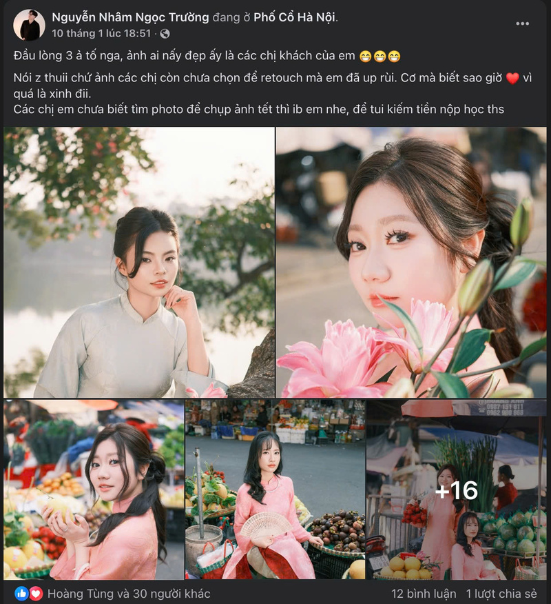 Bạn Đào Thuý Quỳnh (20 tuổi, phường Nghĩa Đô, Hà Nội) chia sẻ: “Mỗi năm tôi đều chụp một bộ ảnh Tết. Không chỉ để đăng mạng xã hội mà còn gửi cho gia đình, bạn bè. Tết bận rộn, đôi khi chỉ cần nhìn lại bộ ảnh cũng thấy không khí xuân rõ ràng hơn”. Năm nay, Quỳnh chi khoảng 3 triệu đồng cho gói chụp trọn gói gồm áo dài, make up, nhiếp ảnh ngoại cảnh.