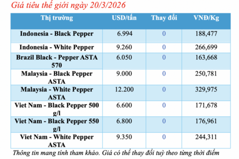 Cập nhật thị trường thế giới từ Hiệp hội Hồ tiêu Quốc tế (IPC) sáng 20/3, hồ tiêu xuất khẩu hôm nay không ghi nhận biến động mới. Các thị trường đều ...