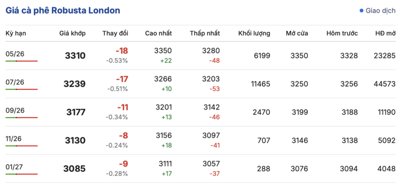 Cụ thể, trên sàn giao dịch London, giá cà phê trực tuyến Robusta hợp đồng giao kỳ hạn tháng 5/2026 giảm nhẹ 18 USD/tấn so với phiên giao dịch gần nhất, đạt 3.310 USD/tấn. Hợp đồng giao kỳ hạn tháng 1/2027 cũng giảm nhẹ 9 USD/tấn, đạt 3.085 USD/tấn.