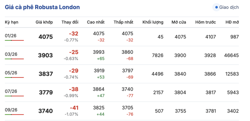 Kết thúc phiên giao dịch gần nhất, giá cà phê Robusta tại London đảo chiều giảm nhẹ đồng loạt trong các kỳ giao hàng. Cụ thể, kỳ giao tháng 1/2026 giảm 32 USD/tấn, xuống mức 4075 USD/tấn. Hợp đồng giao kỳ hạn tháng 9/2026 cũng giảm 41 USD/tấn, đạt mức 3740 USD/tấn.