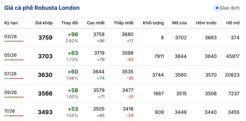 Kết thúc phiên giao dịch gần nhất, giá cà phê Robusta tại London tiếp tục ghi nhận phiên tăng đồng loạt trong các kỳ giao hàng. Cụ thể, kỳ giao tháng 1/2026 tăng mạnh 96 USD/tấn, đạt mức 3759 USD/tấn. Trong khi đó, hợp đồng giao kỳ hạn tháng 11/2026 cũng tăng 53 USD/tấn, lên mức 3493 USD/tấn.