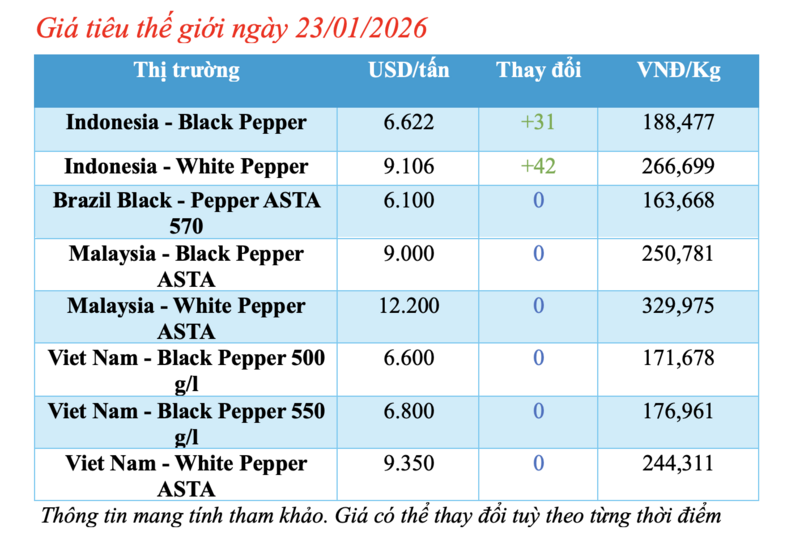 Cập nhật giá tiêu thế giới từ Hiệp hội Hồ tiêu Quốc tế (IPC) sáng 23/01/2026, hồ tiêu xuất khẩu hôm nay ghi nhận biến động mới từ thị trường Indonesia. Các thị trường khác đều duy trì mức giá ổn định so với phiên giao dịch hôm qua.