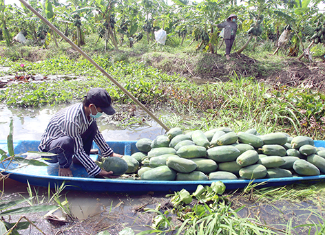 Còn những loại trái cây khác cũng điêu đứng không kém. Vườn đu đủ ruột vàng của ông Nguyễn Văn Điều, ở ấp Mỹ Quới, cũng bán tháo với giá 1.000 đồng/kg vì đã chín rộ. Ông Điều bán 1,2 tấn đu đủ mà không đủ để trả chi phí chăm sóc vườn. Ông ngao ngán kể: “Cứ 4 ngày là đu đủ đến đợt phải hái nhưng giờ chợ cũng không bán, lái không vô mua được, nếu có thì cũng rất ít. Đợt vừa rồi, tôi muốn cho cá ăn đu đủ luôn vì có bán cũng lỗ. Bây giờ còn 20 tấn đu đủ tới lứa chuẩn bị hái tôi càng sốt ruột hơn”.