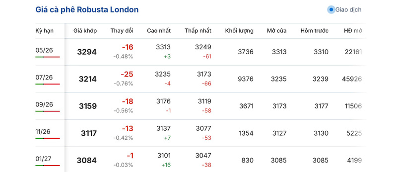 Cụ thể, trên sàn giao dịch London, giá cà phê trực tuyến Robusta hợp đồng giao kỳ hạn tháng 5/2026 giảm nhẹ 16 USD/tấn so với phiên giao dịch gần nhất, đạt 3.294 USD/tấn. Hợp đồng giao kỳ hạn tháng 1/2027 cũng giảm nhẹ 1 USD/tấn, đạt 3.084 USD/tấn.