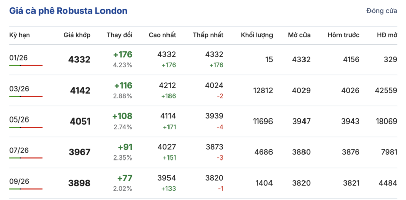 Kết thúc phiên giao dịch gần nhất, giá cà phê Robusta tại London ghi nhận phiên bật tăng mạnh mẽ trong các kỳ giao hàng. Cụ thể, kỳ giao tháng 1/2026 tăng mạnh 176 USD/tấn, lên mức 4332 USD/tấn. Trong khi đó, hợp đồng giao kỳ hạn tháng 9/2026 cũng tăng 77 USD/tấn, đạt mức 3898 USD/tấn.
