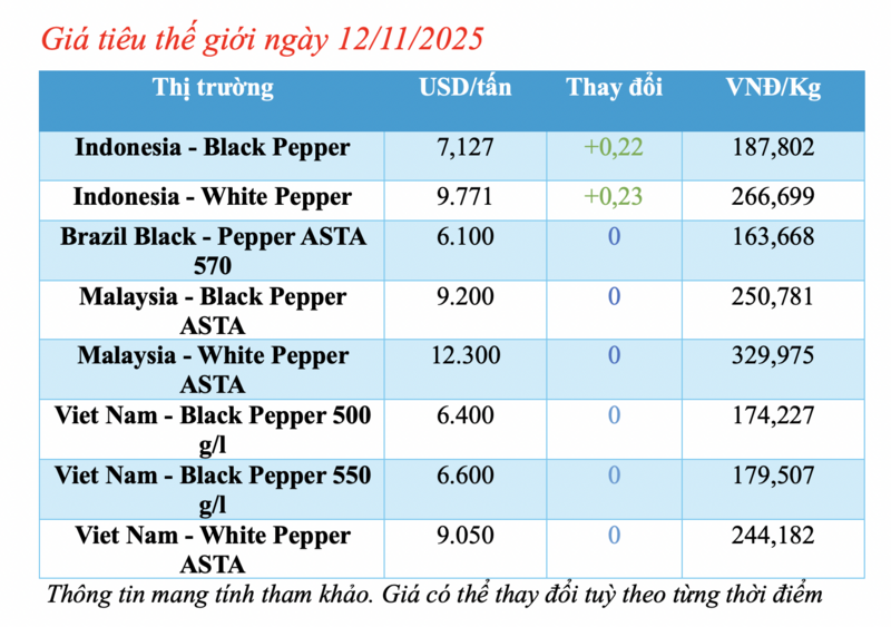 Giá tiêu các loại của Việt Nam không thay đổi, trong đó, giá tiêu đen của Việt Nam loại 500 gr/l không thay đổi đạt 6.400 USD/tấn; loại 550 gr/l không thay đổi đạt 6.600 USD/tấn.