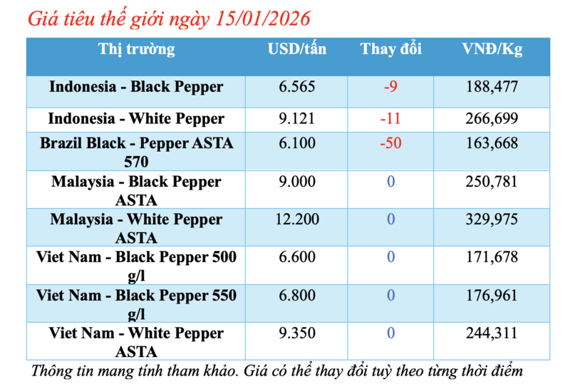 Giá hồ tiêu thế giới 15/01/2026: Thị trường sụt giảm