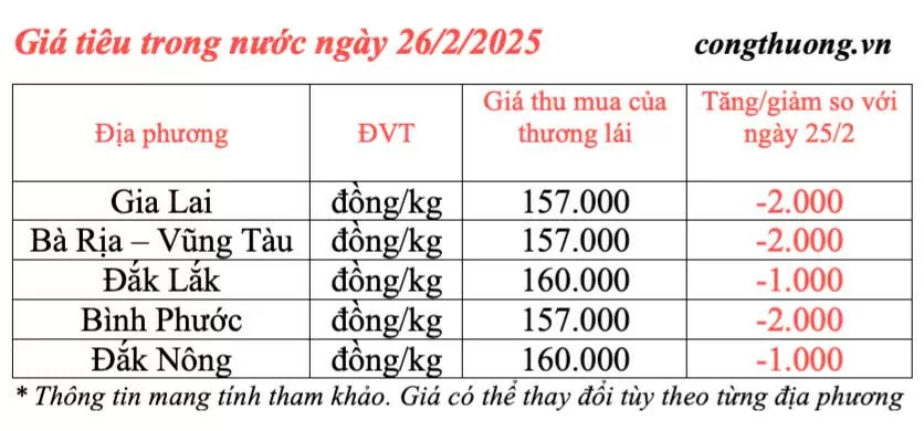Giá tiêu hôm nay được cập nhật lúc 4h30 sáng ngày 26/2/2025 như sau, giá tiêu trong nước tiếp tục giảm sâu, mức giảm từ 1.000 - 2.000 đồng/kg, nhiều địa phương giá tiêu đã xuống dưới mốc 160.000 đồng/kg. Hiện giá tiêu thu mua trung bình tại các địa bàn trọng điểm là 158.200 đồng/kg.