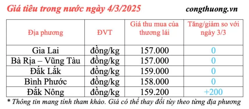 Giá tiêu hôm nay được cập nhật lúc 4h30 sáng ngày 4/3/2025 như sau, giá tiêu trong nước duy trì mức ổn định và tăng nhẹ so với hôm qua. Hiện giá tiêu thu mua trung bình tại các địa bàn trọng điểm là 158.000 đồng/kg.