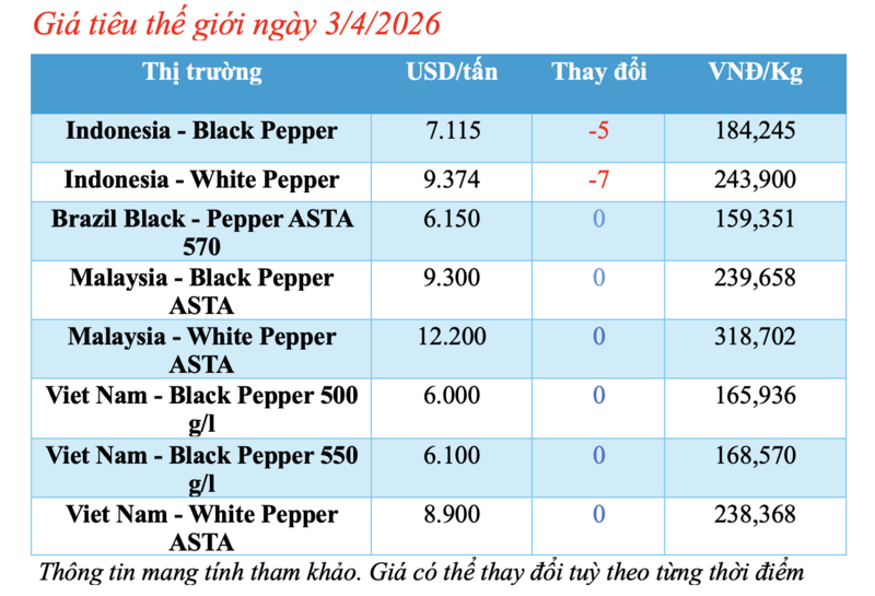 Cập nhật dữ liệu từ Hiệp hội Hồ tiêu Quốc tế (IPC) sáng 3/4, hồ tiêu xuất khẩu hôm nay ghi nhận phiên biến động nhẹ thị trường Indonesia. Trong khi đó, các thị trường xuất khẩu hồ tiêu lớn khác đều duy trì ổn định.